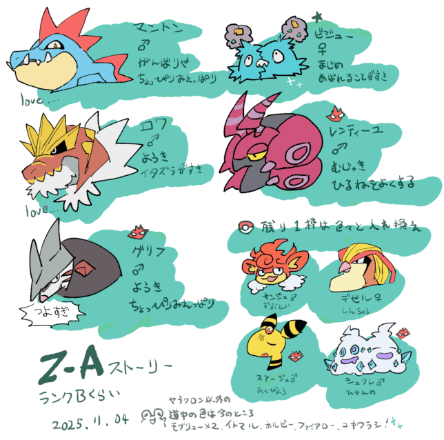 Z-A手持ち 2025年11月4日 好きなポケモンが多すぎてパーティがなかなか固定化されない。でもヒスイもSVもそうだったので最近のプレイングはそんなかんじ。 今は化石をころがしている。ひかおま効かないの最高。 1317匹目 やったぜ。 ネタバレ感想(更新中) 鍵:za 【ポケモンZ-A】ネタバレ感想(更新中)